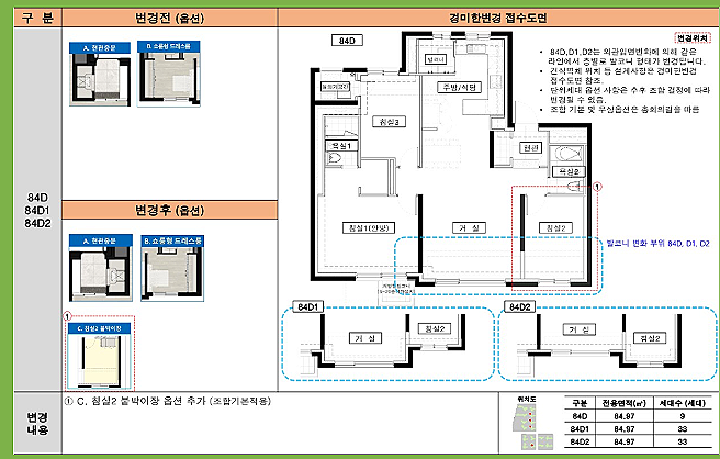 84D/D1/D2 타입: 3베이 판상형 구조로, 거실과 침실 크기를 조절할 수 있는 옵션을 제공합니다. 남서향에 위치해 있어 채광이 우수하며, 전체적으로 북측과 남측에 분포되어 있습니다.