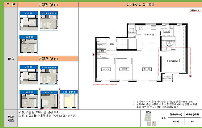 84C1 타입: 84C 타입과 유사하지만, 현관이 'ㄱ'자 형태로 꺾여 있어 공간 활용이 더욱 효율적입니다.