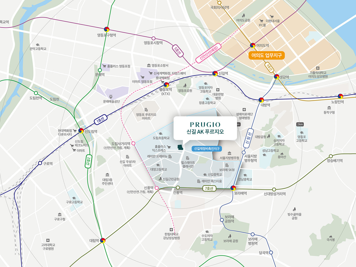 신길 AK 푸르지오는 서울의 중심지인 신길동에 위치해 있으며, 교통 편의성이 뛰어납니다. 신길역과 가까워 서울 지하철 1호선과 5호선을 쉽게 이용할 수 있으며, 여의도와 강남 등 주요 비즈니스 지역으로의 접근이 용이합니다. 이로 인해 직장인들에게는 출퇴근이 편리하며, 생활의 편리함을 더해줍니다.
