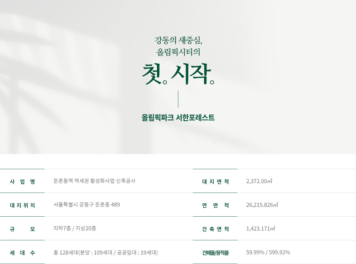 위치: 서울 강동구 둔촌동 489번지 (둔촌동역 역세권) 규모: 지하 7층 ~ 지상 20층, 1개 동, 총 128세대 (일반분양 109세대) 평형: 전용 49㎡, 59㎡, 69㎡