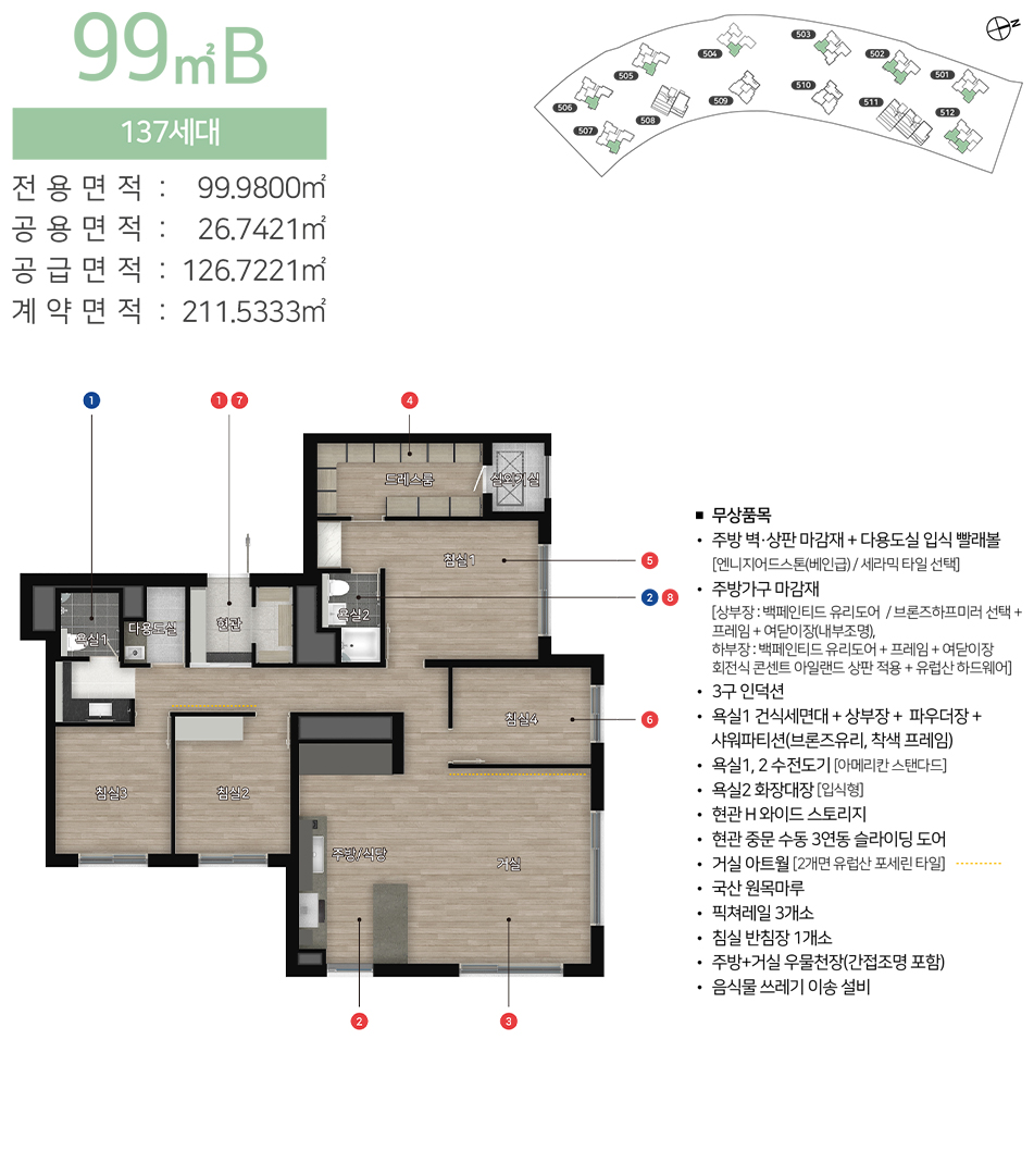 이 아파트 단지는 현대적이고 세련된 디자인으로 설계되었으며, 고급스러운 인테리어와 최신 건축 기술을 사용하여 지어졌습니다. 넓은 내부 공간과 효율적인 공간 활용은 가족 단위 생활에 적합하며, 입주민들에게 쾌적한 생활환경을 제공합니다.
